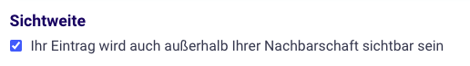 💡 Tipp: In deinen Einstellungen kannst du angeben, ob du nur Geschenke oder auch Schnäppchen in deiner Übersicht sehen möchtest.Sichtweite: Aktiviere 'Umliegende Nachbarschaften', um Nachbarn im Umkreis von 25 km zu erreichen, oder deaktiviere dies, um nur deine eigene Nachbarschaft zu informieren.