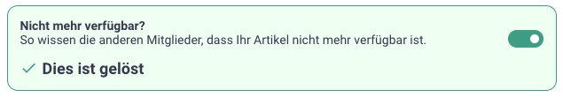 Fertig? Markiere deine Kleinanzeige als 'Erledigt' über den Schieberegler bei deinem Beitrag, sobald der Artikel weg ist. Markiere deine Kleinanzeige als 'Erledigt': Zeige an, dass der Artikel einen neuen Besitzer gefunden hat, indem du den Schieberegler bei deinem Beitrag nach rechts (grün) verschiebst. Beachte, dass du diese Option nur hast, wenn du eine Anzeige über die Schaltfläche 'Verschenken' oder über 'Kleinanzeigen' erstellt hast.