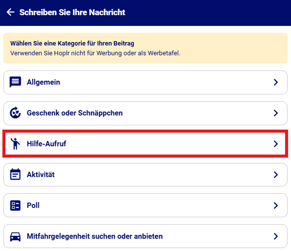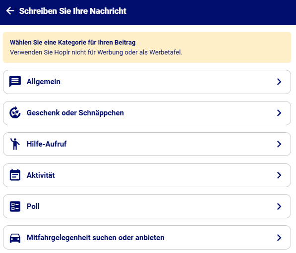 Wenn du eine Nachricht in der Nachbarschaft posten möchtest, musst du zuerst eine Kategorie auswählen. Klicke auf eines der Kacheln oben in der Übersicht.