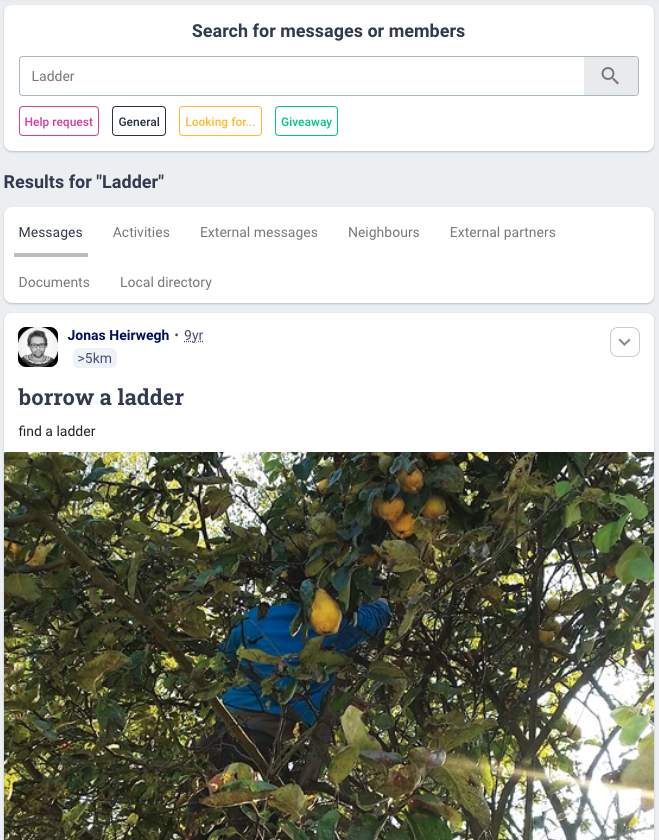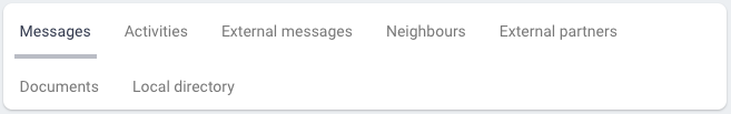 - At the bottom, indicate what you are searching for: a post, activity, external post (post from an external organization), neighbor, external organization (e.g., municipality, partner), a document, a business or association from the local directory.