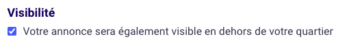 💡 Astuce : Dans vos paramètres, vous pouvez indiquer si vous souhaitez voir uniquement des dons ou aussi des bonnes affaires dans votre aperçu.Visibilité : Cochez « Quartiers environnants » pour atteindre les voisins dans un rayon de 25 km, ou décochez pour informer uniquement votre propre quartier.