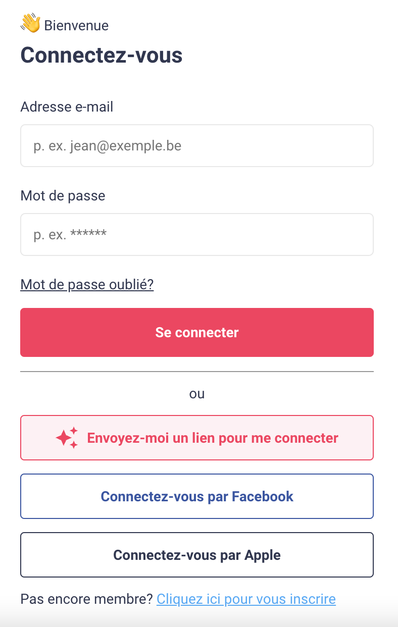 La manière de vous connecter dépend de la façon dont vous vous êtes inscrit. Dans la plupart des cas, c'est via une adresse e-mail et un mot de passe. Mais vous pouvez également être inscrit via Apple Login ou Facebook Login.