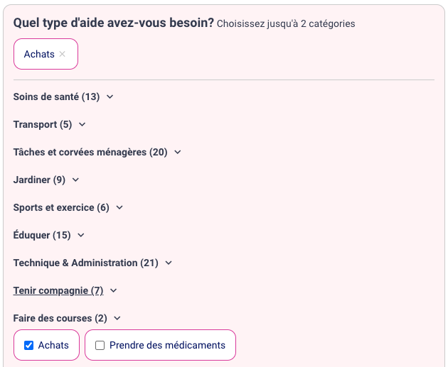 - Choisissez jusqu’à deux catégories appropriées pour votre demande d’aide. (optionnel)