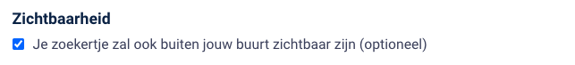 Zichtbaarheid: Indien deze optie aangevinkt staat, zal je zoekertje ook zichtbaar zijn in de zoekertjes van omliggende buurten. Het zoekertje wordt gedeeld met buurten binnen een straal van 25 km. Wil je je zoekertje enkel delen met je eigen buurt? Dan kan je deze optie uitvinken.