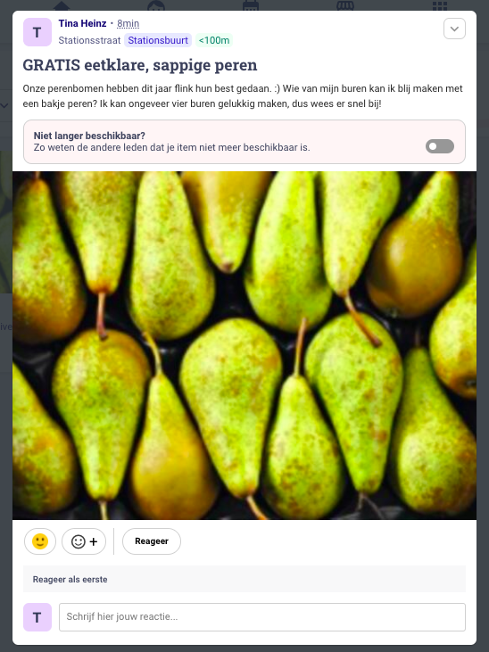 Prijs: Bij het aanmaken van een zoekertje kies je of het gaat om een weggevertje of een koopje. Deze keuze is belangrijk, want sommige buurtleden filteren hun buurtoverzicht op weggevertjes of koopjes.