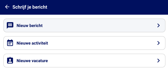 Kies het type bericht dat je wilt plaatsen (bericht, activiteit, of vacature).