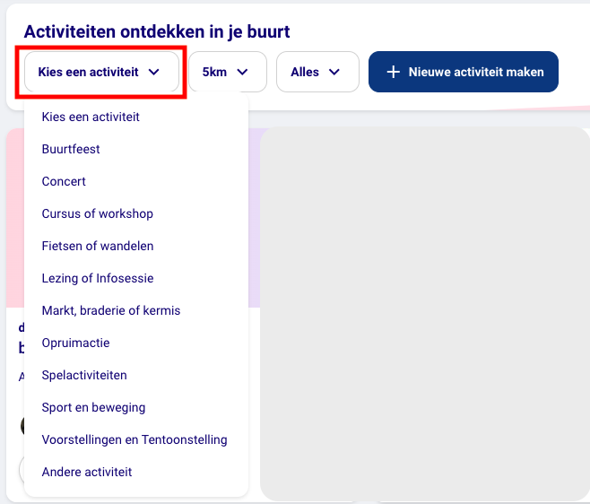 - Kies een activiteit: Je kan een specifiek type activiteit selecteren waarin je interesse hebt, zoals bijvoorbeeld sport, een lezing of een workshop. Indien je alle activiteiten in de buurt wilt zien, hoef je hier niets te selecteren.
