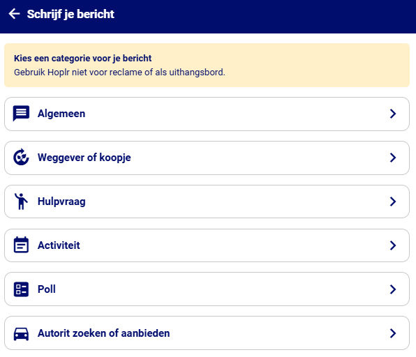 Als je een bericht wil plaatsen in de buurt via het "+" symbool, dien je eerst een categorie te kiezen. Klik op één van de types berichten: